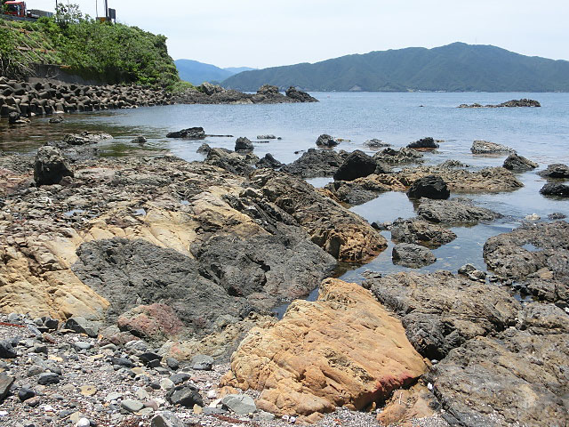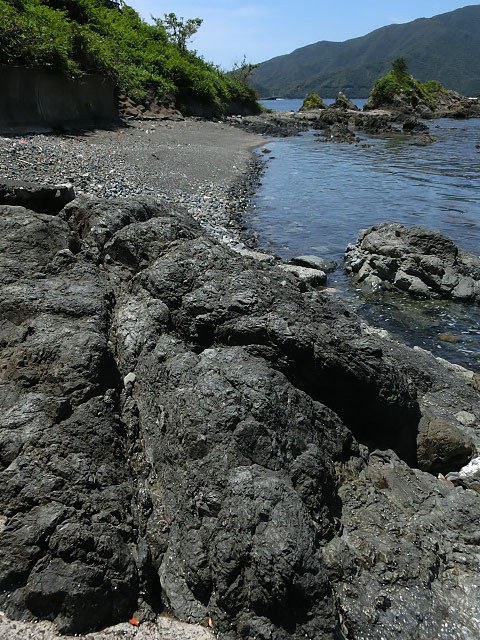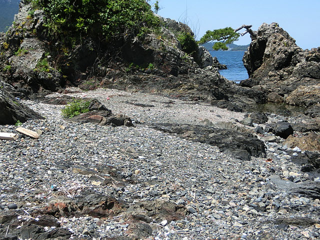 でっかい岩に砂利浜・・