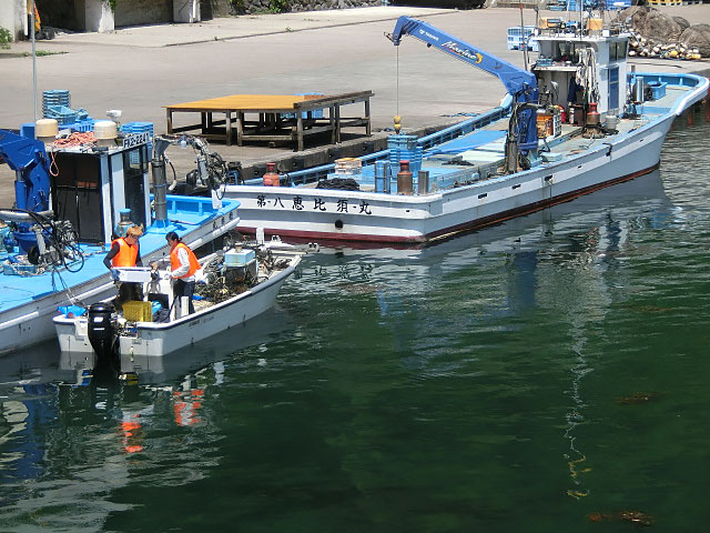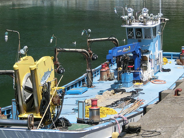 変わった漁船 クレーンがついている 設置した網を回収する船?