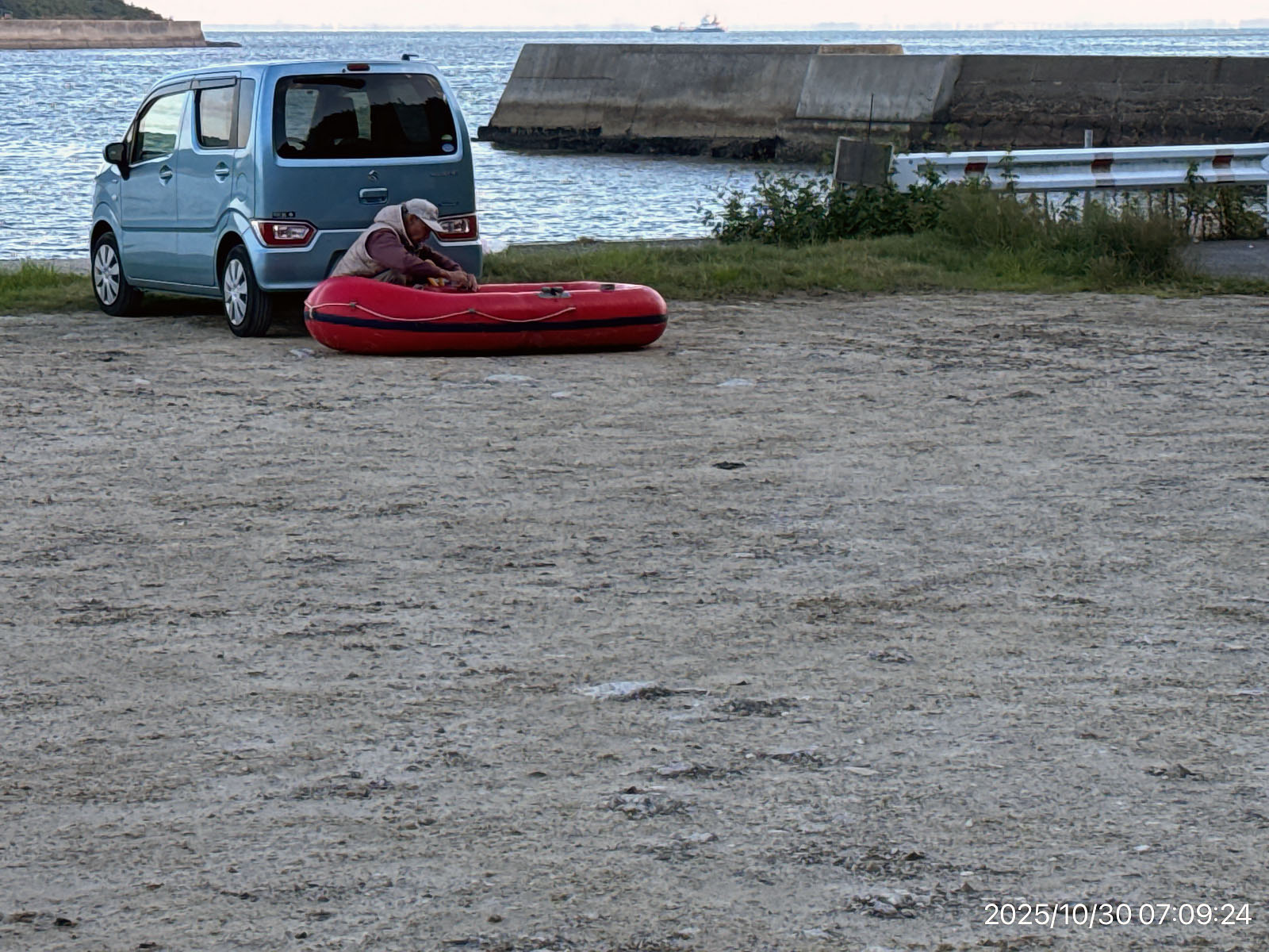 ボートを膨らませてるおじいさん こんな寒い時にボート遊び?Σ( ̄□ ̄;)