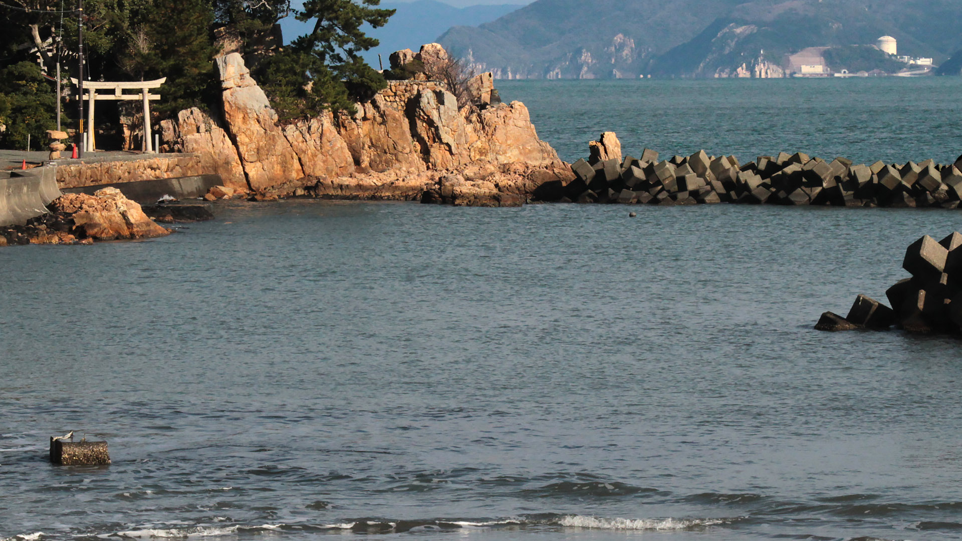 神社入り口 ここから見ると、あちこち歩けそうに見えるが・・ 右奥にあるのは原発?(;´д`)